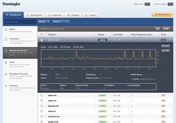 Dominder is a control panel for websites. What is does well is help entrepreneurs manage websites, both their own and those of clients. This services monitors the status of websites, issues registration renewal reminders and other important notifications, checks for malware and black listing, stores notes, backs up financial information, and more. Basically, Dominder domain tools help free website owners from worrying about routine (but essential) upkeep so they can focus on more pressing business concerns.