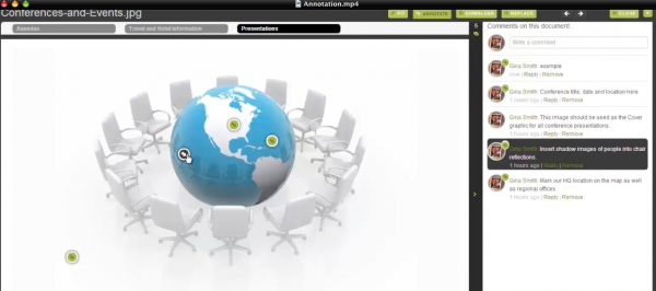 In addition to Dropbox integration and drag and drop technology making it easy to move files into projects, annotations give teams a great tool for combining and gathering feedback on a piece of collaborative content. Point and click anywhere over content, and you open up a dialogue box, where you make your annotations. A comments pane to the right of the file allows multiple team members to view all relevant annotations. Hovering over push pins on the annotated file highlights respective notes in the comments pane.